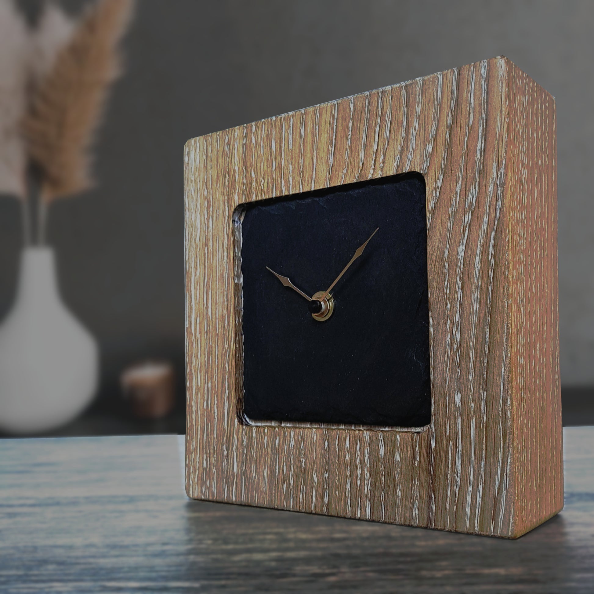 Diese außergewöhnliche Uhr vereint die natürliche Schönheit von Holz und Schiefer auf harmonische Weise. Sie wird aus einem einzigen Stück massivem Holz gefertigt und besticht durch ihre schlichte, zeitlose Eleganz. Das Ziffernblatt aus echtem Schiefer verleiht der Uhr eine markante und zugleich edle Ausstrahlung. Mit einer Größe von 175 mm x 175 mm x 50 mm fügt sie sich sowohl als funktionales Zeitmesser als auch als stilvolles Dekorationselement in jedes Ambiente ein. Jede Uhr ist ein Unikat und trägt die Handschrift meisterlicher Handwerkskunst – ein Ausdruck von Naturverbundenheit und Qualität.