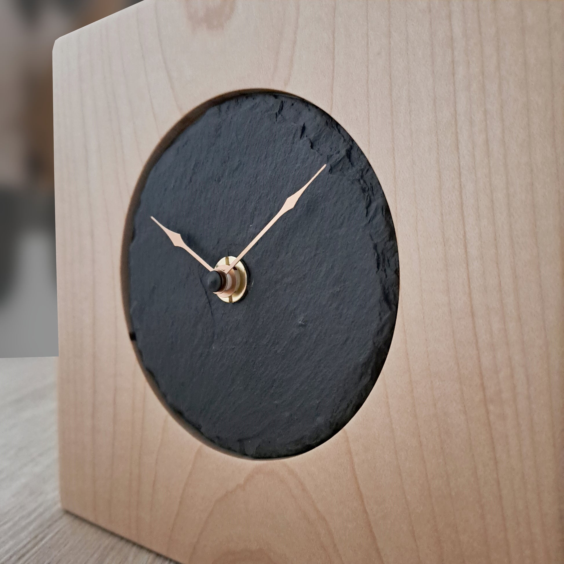 Handgefertigte Uhr aus massivem Holz mit Schiefer-Ziffernblatt